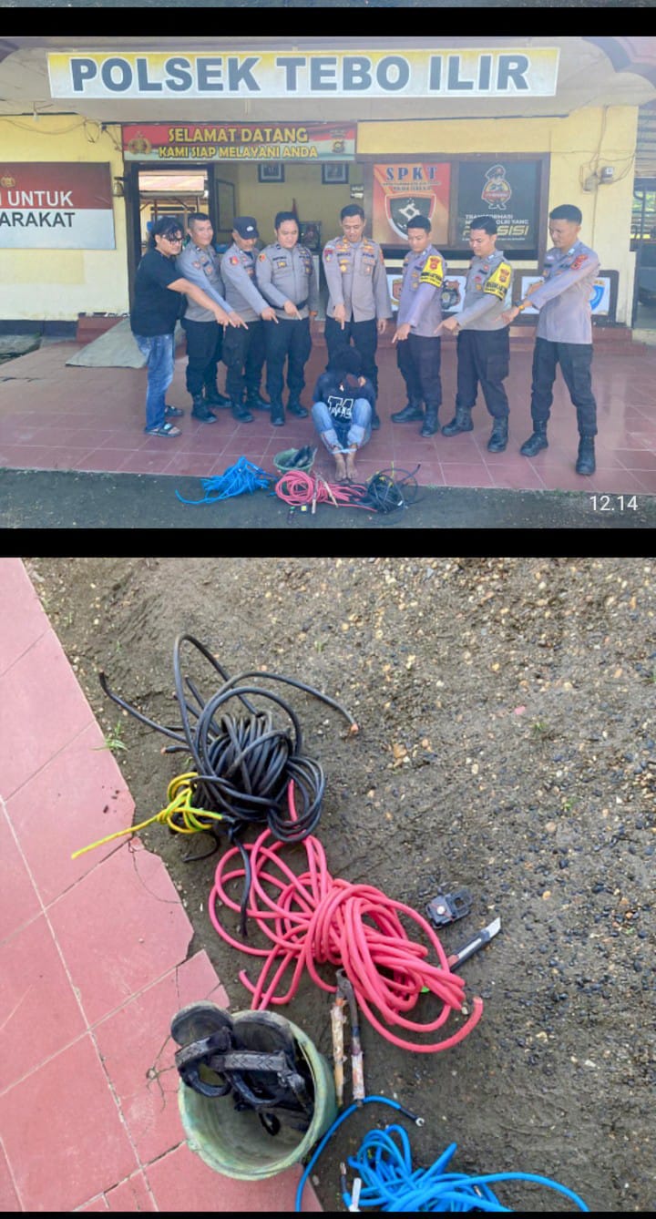 Tebo- Globalberita.id ~Polsek Tebo Ilir Kabupaten Tebo berhasil mengamankan M (32) setelah terbukti melakukan pencurian kabel power pada salah satu tower milik PT Telkomsel di kelurahan sungai bengkal, RT 03/01 Kecamatan Tebo Ilir.