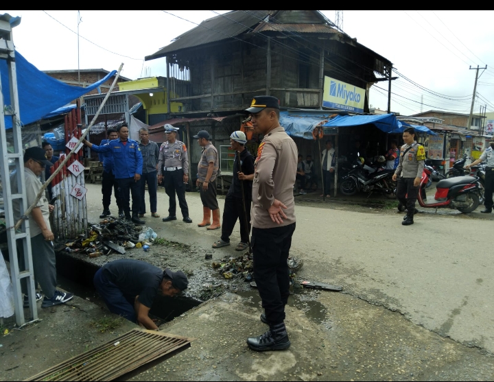 Kapolsek, camat,lurah dan kepala pasar gotong royong bersih parit pasar sungai bengkal
