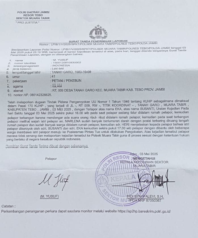 Tebo globalberita.id – M. Yusuf, suami korban Marlena, melaporkan dugaan tindak pidana pengeroyokan kepada Polsek Muara Tabir pada Jumat, 3 Mei 2025. Insiden tersebut terjadi di Jalan RI 008, Tanah Garo, Muara Tabir, Kabupaten Tebo, Jambi, pada Sabtu, 3 Mei 2025, sekitar pukul 16.00 WIB.